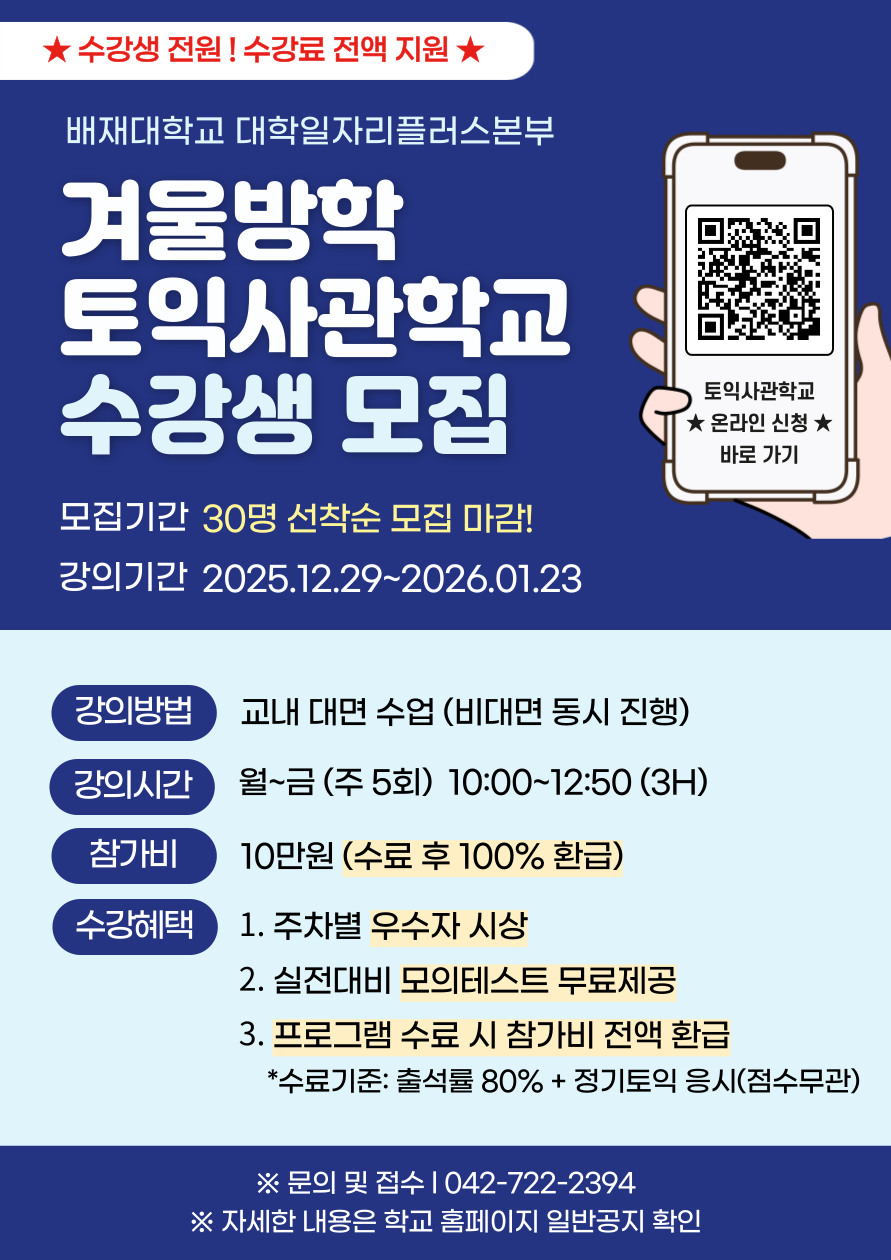 대학일자리플러스본부에서는 겨울방학 동안 학생들의 어학실력 향상 및 공인어학성적 취득 지원을 위해 「2025학년도 겨울방학 토익사관학교」를 개설합니다. 방학기간을 활용하여 어학 점수 향상을 희망하는 학생은 반드시 신청하시기 바랍니다.